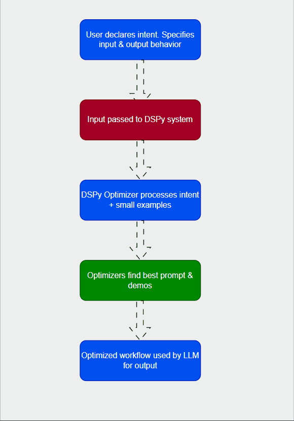 - DSPy Optimizes: DSPy then uses an optimizer to learn the best way to prompt the LLM, select demonstrations, or even re-arrange computational steps to fulfill your declared goal. This optimization happens on a small set of examples, almost like a mini-training phase.