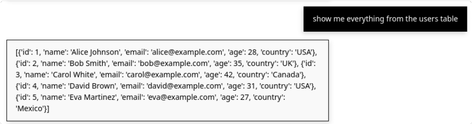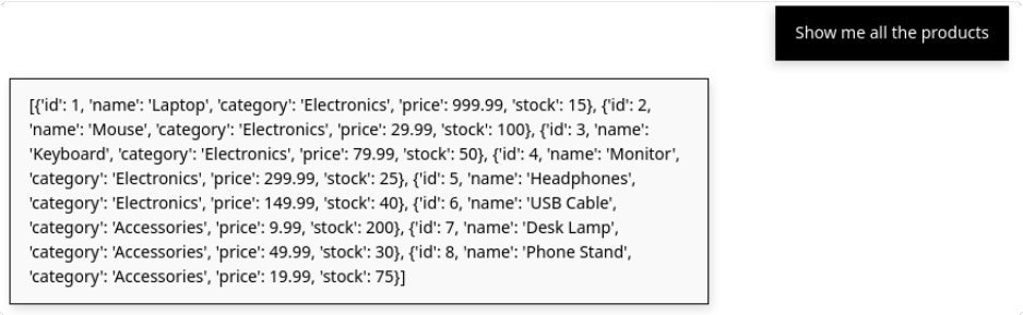 return f"Error executing query: {str(e)}"When I asked it to show all products, it worked exactly as intended.
